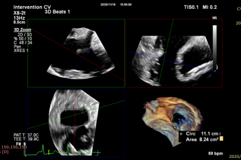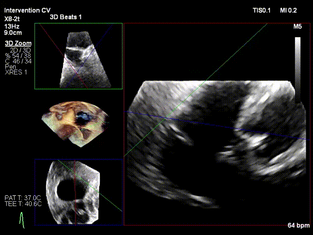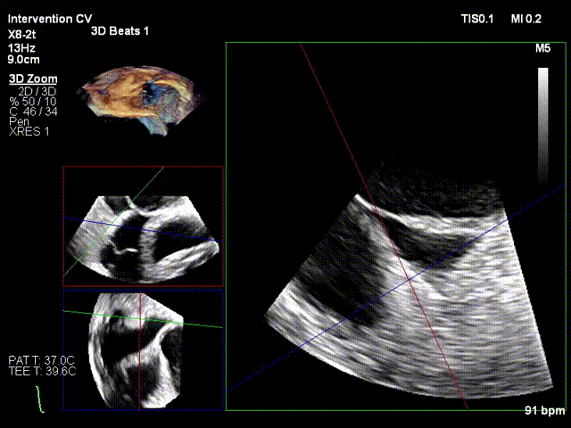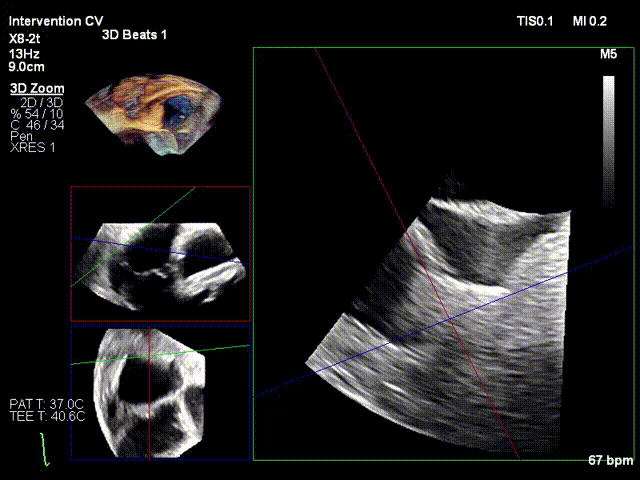 After the patient was placed under general anesthesia, the jugular vein was punctured intraoperatively to establish surgical access. An 18Fr delivery sheath was advanced along a stiff guidewire to the mid-inferior right atrium, and the delivery system was introduced under ultrasound guidance. A 12T K-Clip® device was implanted at the posterior annulus, and another 12T K-Clip® device at the anteroposterior annulus respectively. The angle between the device and the annulus plane was adjusted through catheter deflection and rotation, directing the tip of the clip device to the target position. The anchoring component was deployed into the annulus under ultrasound MPR mode; after confirming stable traction, the clamping arms were opened and apposed to the annulus, followed by retraction of the anchoring component to close the clamping arms for annuloplasty. The surgical effect was evaluated as satisfactory, and the clip components were then released.