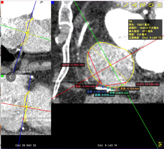 CTA Evaluation: Tricuspid annulus circumference: 13.9cm, area: 14.4cm², with low coronary artery risk.