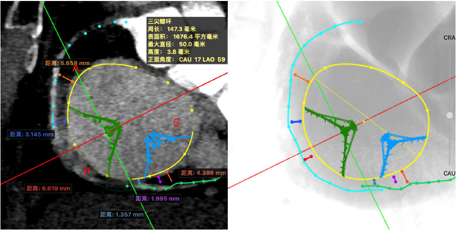 CT findings: The tricuspid annulus has a circumference of 147 mm and an area of 1676 mm². The shortest distance between the right coronary artery and the annulus during systole is 1.35 mm. After comprehensive evaluation, the surgical team decided to anchor the first clip at the posteroseptal commissure, which differs from the conventional posterior‑septal leaflet position, thereby reducing the risk of intraoperative coronary artery distortion.