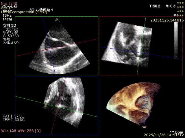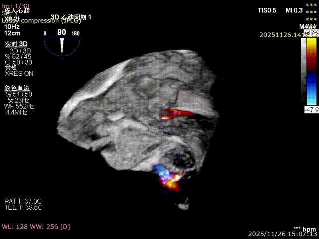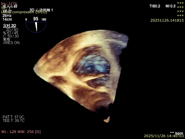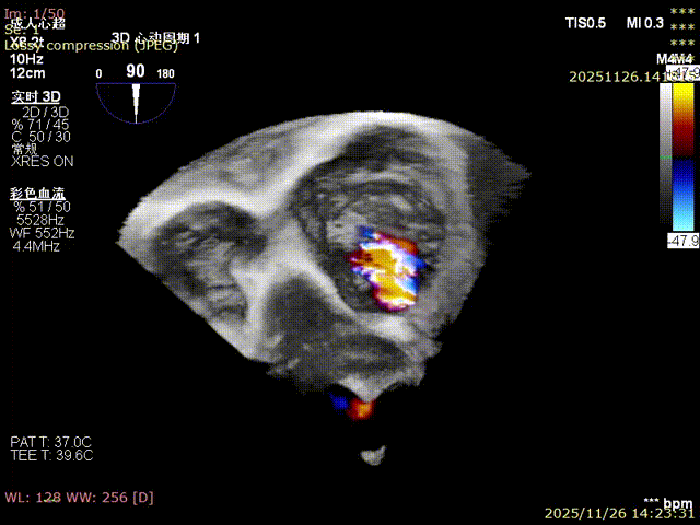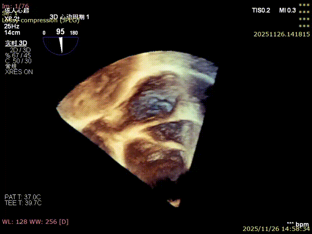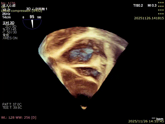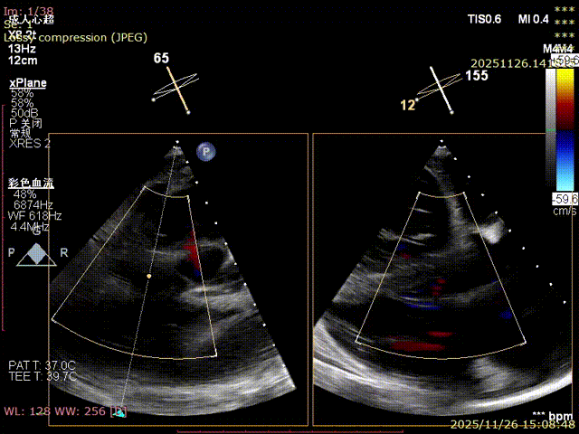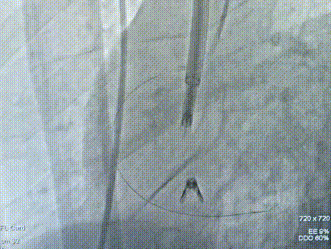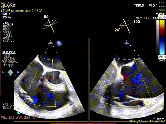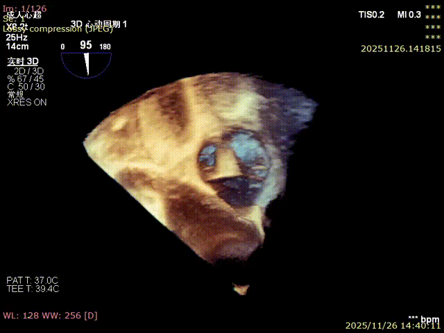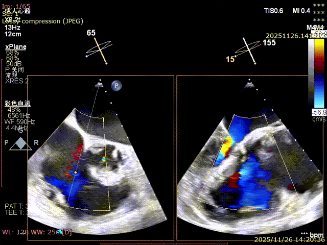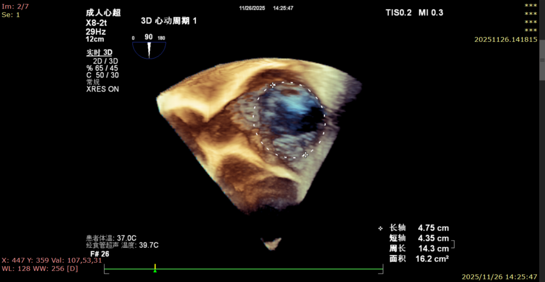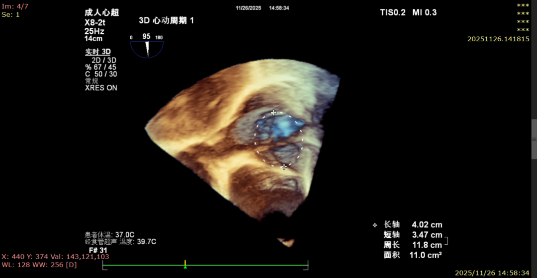 For patients with severe functional tricuspid regurgitation, the cardiovascular team developed a personalized strategy through multidisciplinary consultation and innovatively applied the K-Clip® Transcatheter Tricuspid Annuloplasty System. Intraoperatively, transesophageal echocardiography (TEE) combined with digital subtraction angiography (DSA) was used for imaging guidance. A precise access was established via the right internal jugular vein, and the K-Clip® device was delivered to the tricuspid annulus in the right atrium. After multi‑dimensional imaging localization and confirmation, accurate annuloplasty of the posteroseptal commissure (P‑S commissure) was successfully completed.
