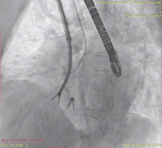 Left Atrial Appendage Closure (LAAC):The delivery system was successfully advanced into the left atrium. Precise measurements of the LAA orifice and depth were taken under multi-angle TEE and DSA guidance. Given the LAA's large orifice (nearly 34mm), conical cauliflower shape, and shallow usable depth, a LACBES2434 occluder was selected. Using the "extreme coin technique," the closure was successfully achieved.