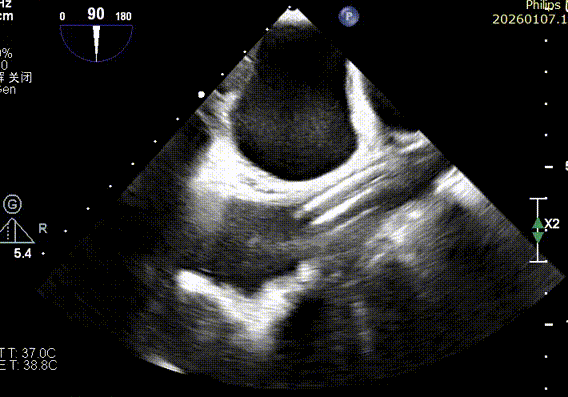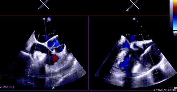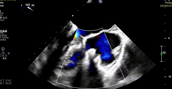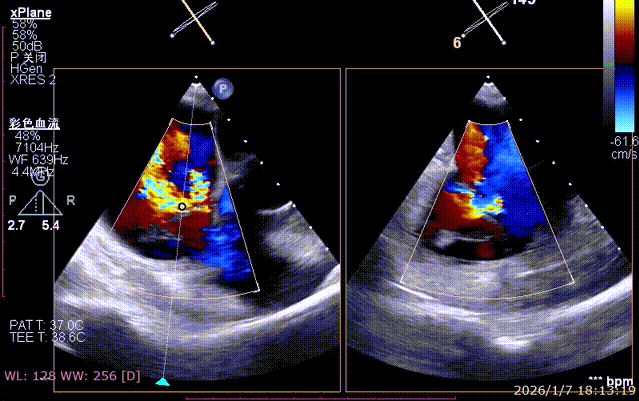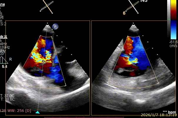 Mitral Valve Repair Stage: Via the transfemoral venous approach, a 4.0 cm atrial septal puncture was performed, and one mitral valve clip was selected. The unique feature of wide-angle deployment effectively resolved the issue of excessive leaflet tension during valve clip closure. Under the precise guidance of ultrasound, one clip was successfully implanted at the site of the widest regurgitation in the A2-P2 segment of the mitral valve. Immediate postoperative TEE assessment showed that mitral regurgitation was reduced to trivial (1+), the mean transvalvular pressure gradient was only 3 mmHg, and pulmonary venous retrograde flow was significantly improved.
